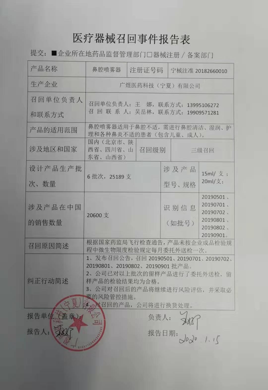 广煜医药科技(宁夏)有限公司对鼻腔喷雾器主动召回
